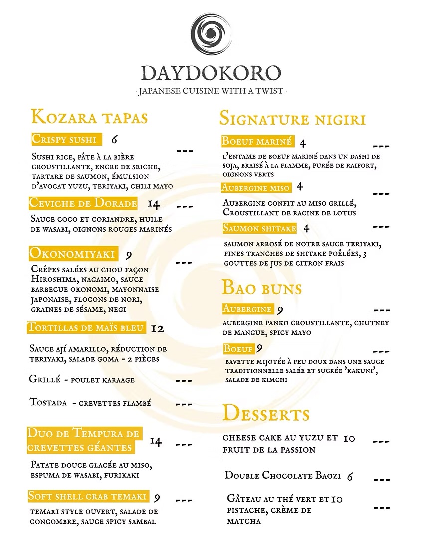 Daydokoro, c'est une expérience culinaire unique où la tradition japonaise rencontre les saveurs du monde. Notre restaurant japonais fusion propose une cuisine raffinée et inventive, alliant la fraîcheur des produits japonais à des influences modernes et internationales. Sushi revisités, baos gourmands et plats innovants vous invitent à un voyage gustatif entre authenticité et créativité.